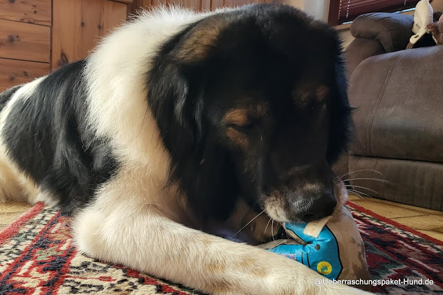 Die letzten Momente - dann war die Naht offen und die Füllung verteilt. Aber er hatte fast 1 Stunde viel Spaß damit